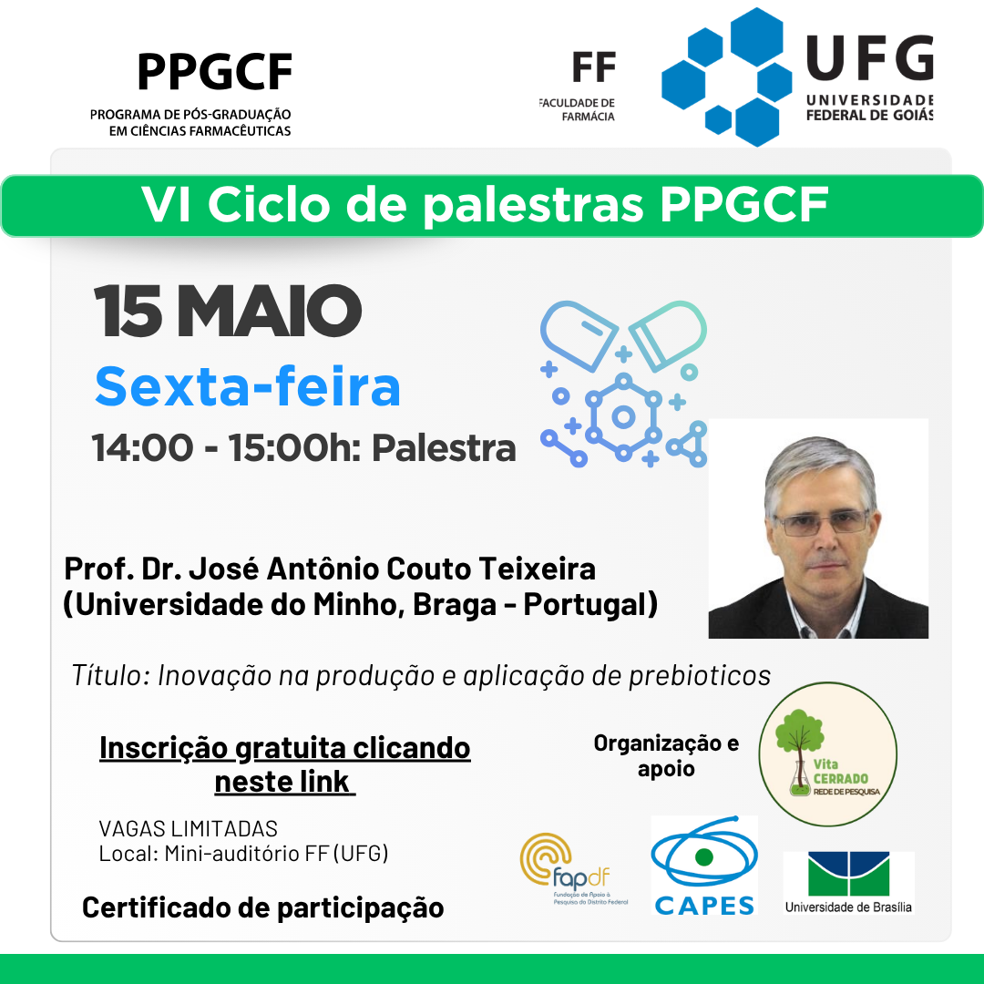 No dia 15 de maio de 2026, o Professor José Antônio Couto Teixeira, da Universidade do Minho, em Portugal, visitará o Programa de Pós-Graduação em Ciências Farmacêuticas da Universidade Federal de Goiás (PPGCF-UFG) e ministrará a palestra intitulada “Inovação na produção e aplicação de prebioticos".